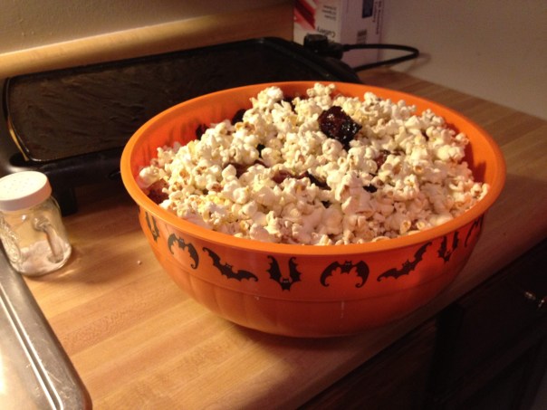 This is a concoction I created in grad school. Popcorn with caramelized bacon. I ate the entire thing. In fact, I ate a bowl of popcorn that size (sans bacon) almost every night until the day that I was diagnosed with diabetes.