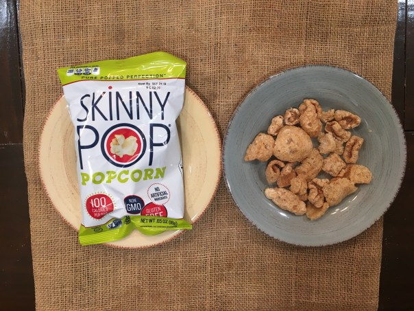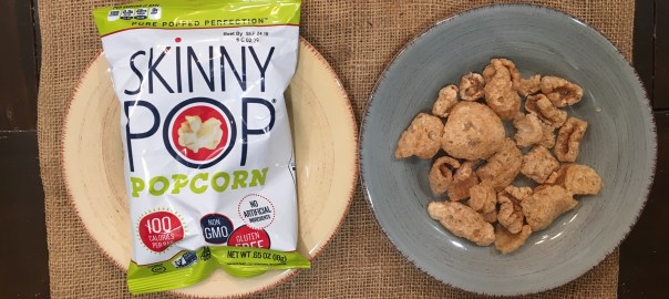 One is a serving of pork rinds, and the other is a bag of Skinny Pop popcorn.